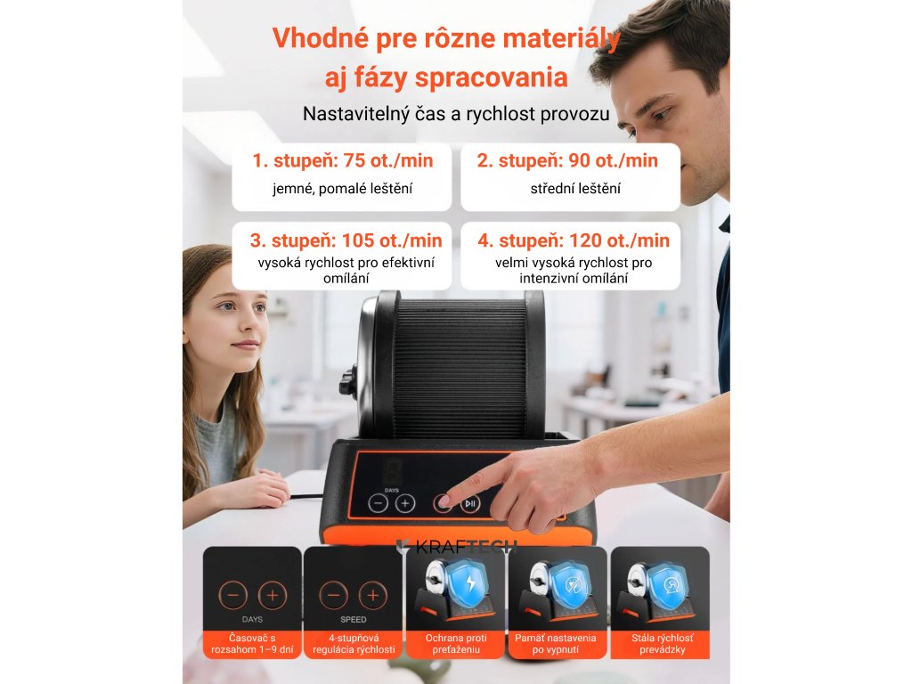 Intuitívny ovládací panel ponúka časovač 1–9 dní a 4 stupne rýchlosti (75–120 ot./min), takže leštenie môžete prispôsobiť rôznym materiálom a fázam opracovania. Vďaka ochrane proti preťaženiu, pamäti po výpadku napájania a konštantnej rýchlosti otáčania sú výsledky vždy rovnomerné a profesionálne.