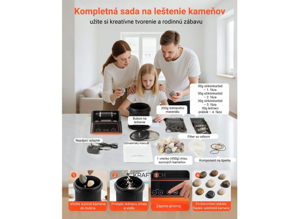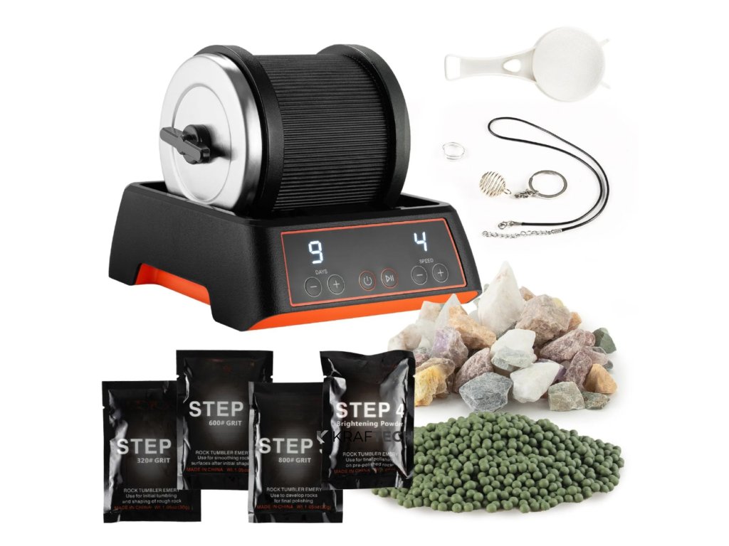 Táto kompletná sada pre leštenie kameňov obsahuje všetko, čo potrebujete na premenenie surových kameňov na lesklé drahokamy. Ideálna pre domáce tvorenie, rodinné aktivity alebo pre každého, kto chce objavovať krásu prírodných minerálov. Vďaka dobre sladenej sade príslušenstva si môžete užiť kreatívny a zábavný proces od začiatku až do konca.
