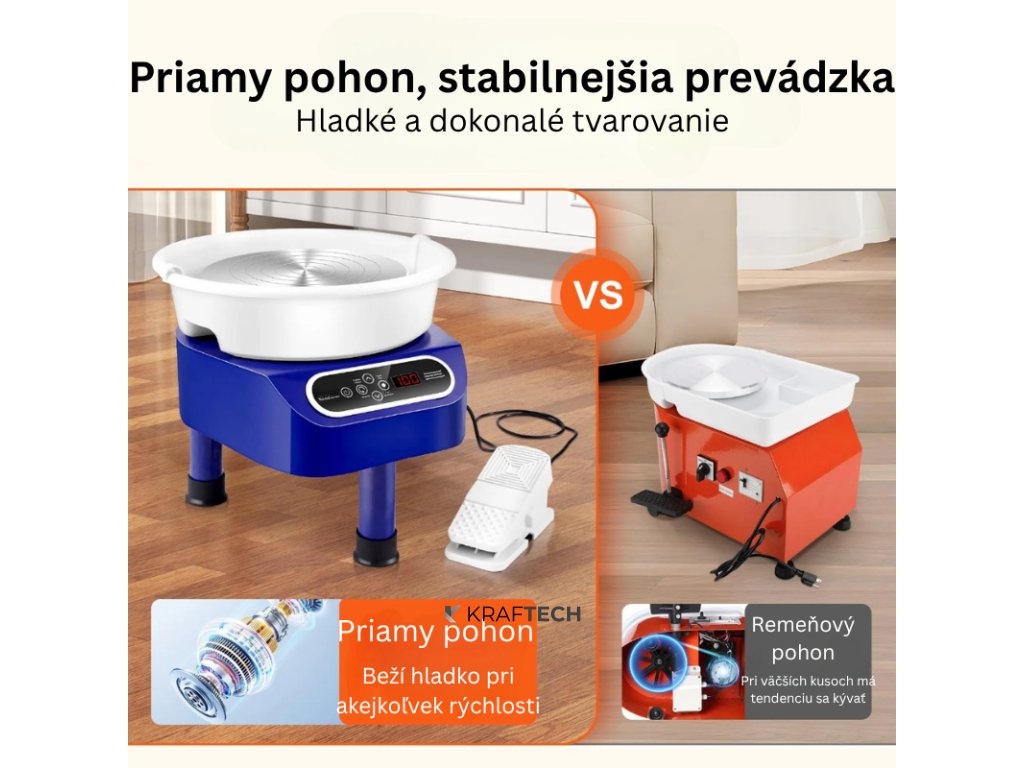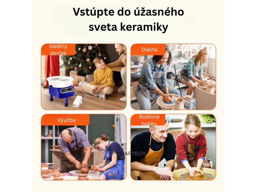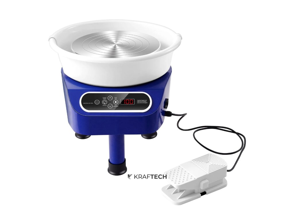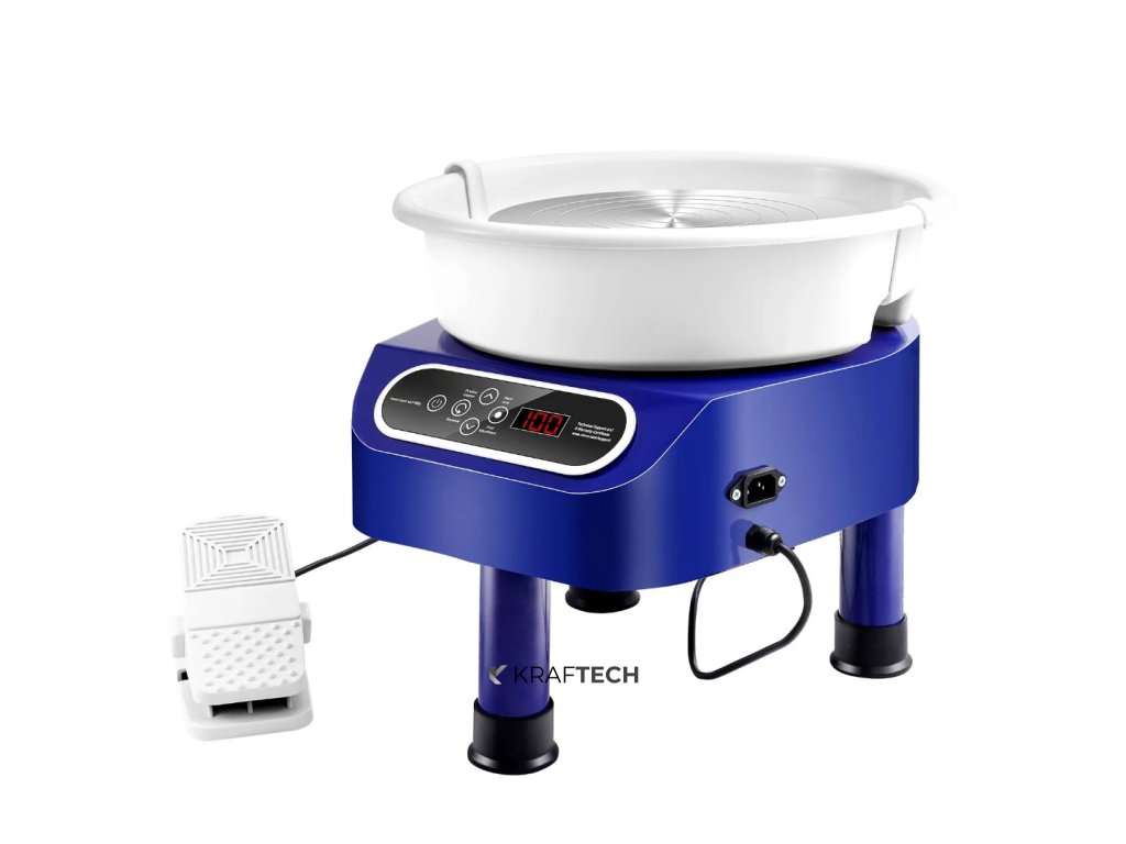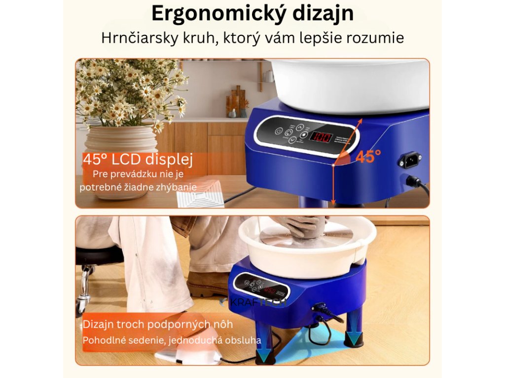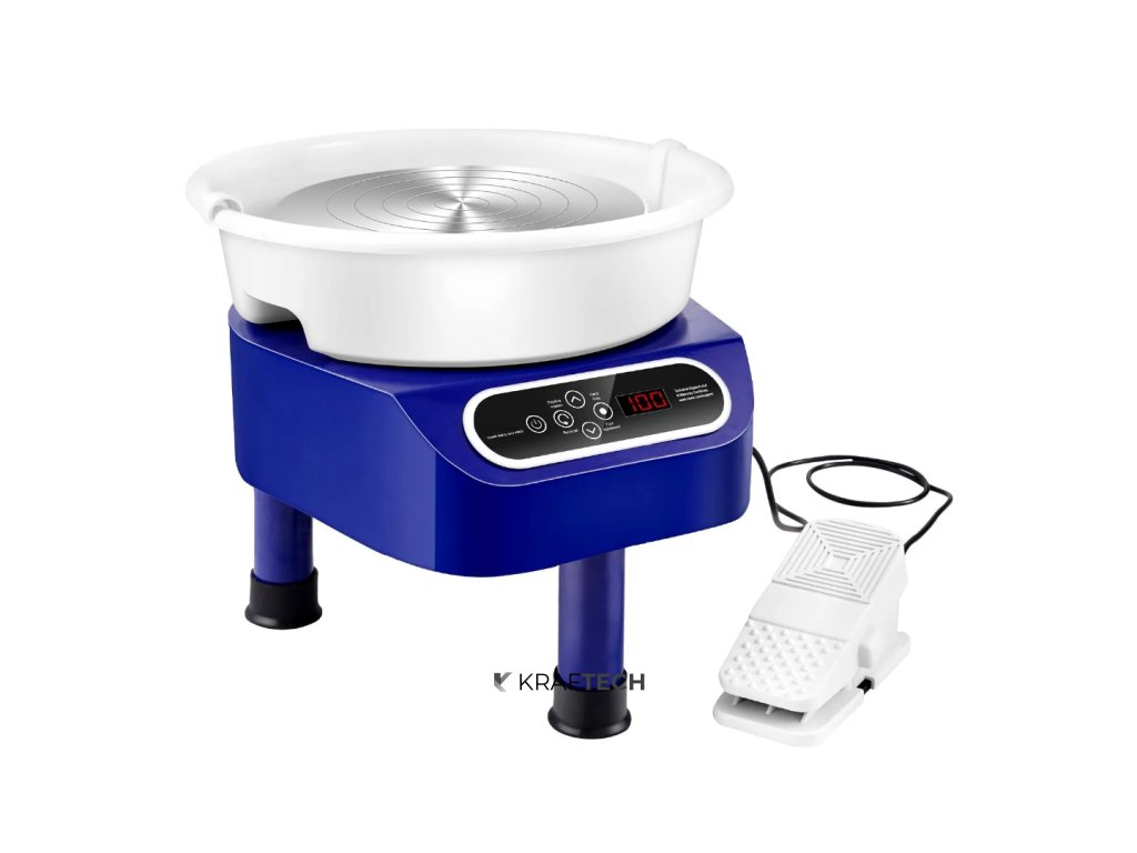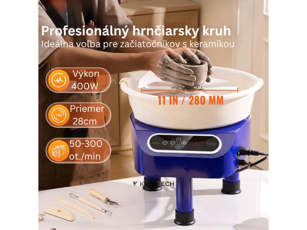 Hrnčiarsky kruh s priamym pohonom, LCD displejom a pedálom s plynulou reguláciou otáčok (50–300 ot./min). Priemer točiacej dosky 28 cm, výkon 450 W, tichá prevádzka (< 60 dB) a odnímateľná konštrukcia pre jednoduché čistenie. Súčasťou je 17-dielna sada nástrojov a vodeodolná zástera.