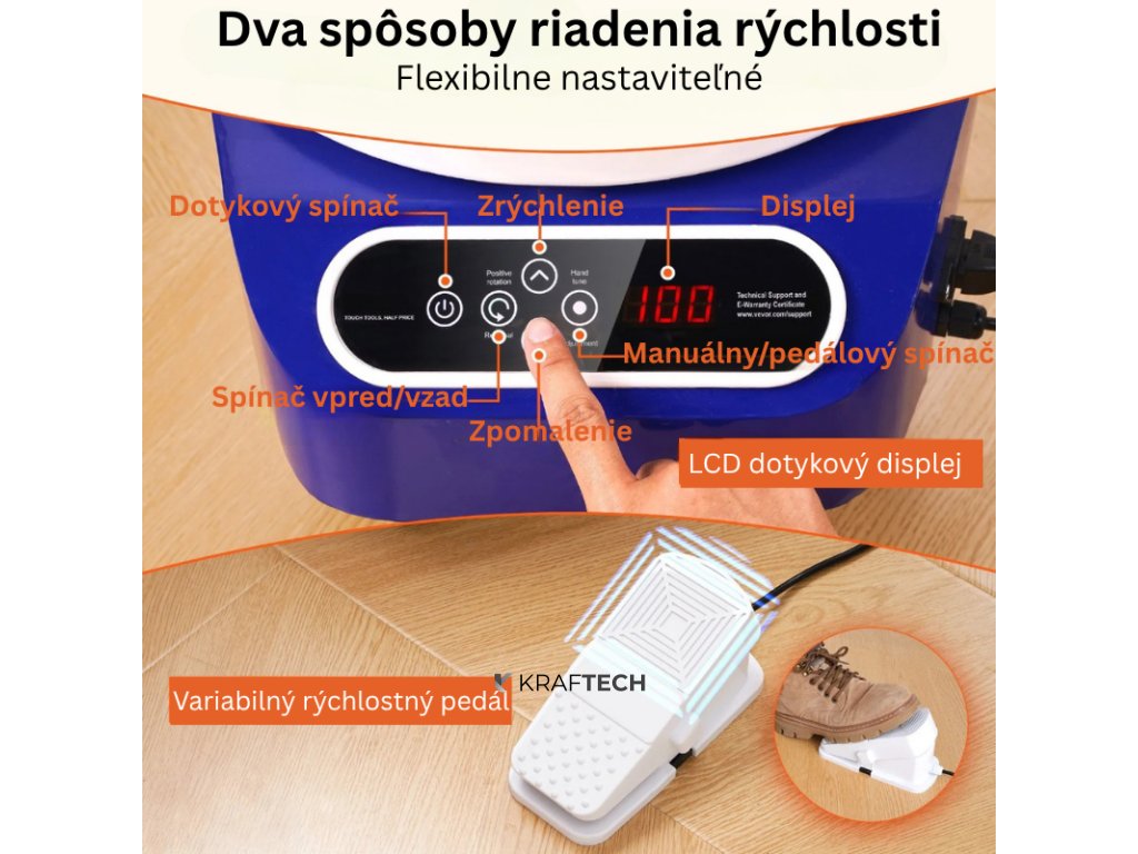 Ovládanie a funkcie: Zariadenie ponúka dvojstupňový systém nastavenia rýchlosti otáčania. Pomocou LCD displeja je možné presne regulovať smer otáčania (vpred alebo vzad) a nastaviť požadovanú rýchlosť v rozsahu 50 až 300 otáčok za minútu. Pedál s plynulou reguláciou otáčok umožňuje pohodlné ovládanie bez potreby prerušiť prácu rukami.