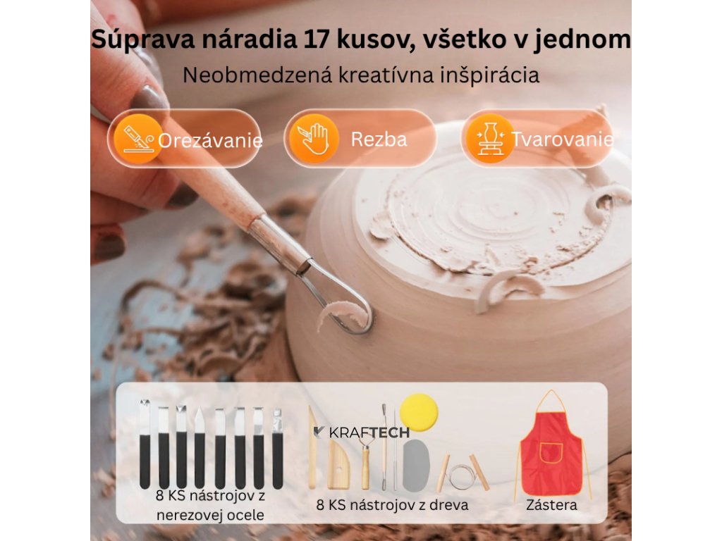 Príslušenstvo: Súčasťou balenia je aj 17-dielna sada nástrojov na prácu s keramikou. Obsahuje 8 nerezových nástrojov, 8 drevených nástrojov na modelovanie a vodeodolnú zásteru, ktorá chráni oblečenie počas práce.
