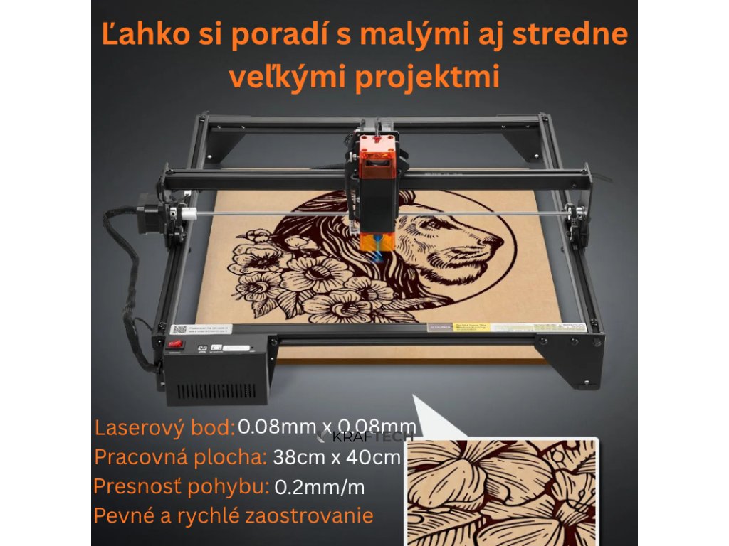 Pracovná plocha má rozmery 380 × 400 mm, čo poskytuje dostatočný priestor pre väčšinu štandardných projektov. Vysoká presnosť gravírovania je dosahovaná vďaka technológii bodovej kompresie s veľkosťou laserového lúča len 0,08 × 0,08 mm. Mechanický pohon zabezpečuje krokový motor v kombinácii so synchrónnym remeňovým systémom, pričom maximálna rýchlosť gravírovania dosahuje až 10 000 mm/min. Prenosová presnosť je udávaná na úrovni 0,2 mm/m, čo je dostatočné aj pre detailné a jemné gravírovacie úlohy.