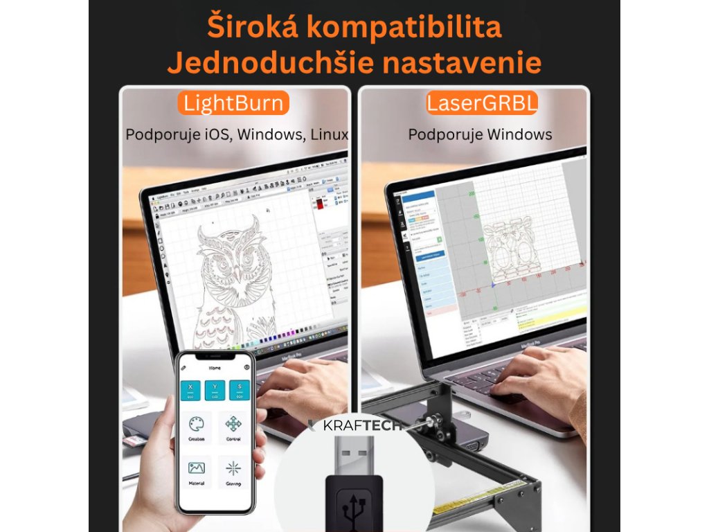 Zariadenie sa pripája k počítaču prostredníctvom USB rozhrania a je kompatibilné so softvérovými balíkmi LightBurn a LaserGRBL, ktoré sú štandardom v oblasti gravírovania. Podporované sú operačné systémy Windows, Linux aj macOS (iOS), čím sa zaručuje široká dostupnosť pre rôzne typy používateľov. Gravírovať možno materiály ako: