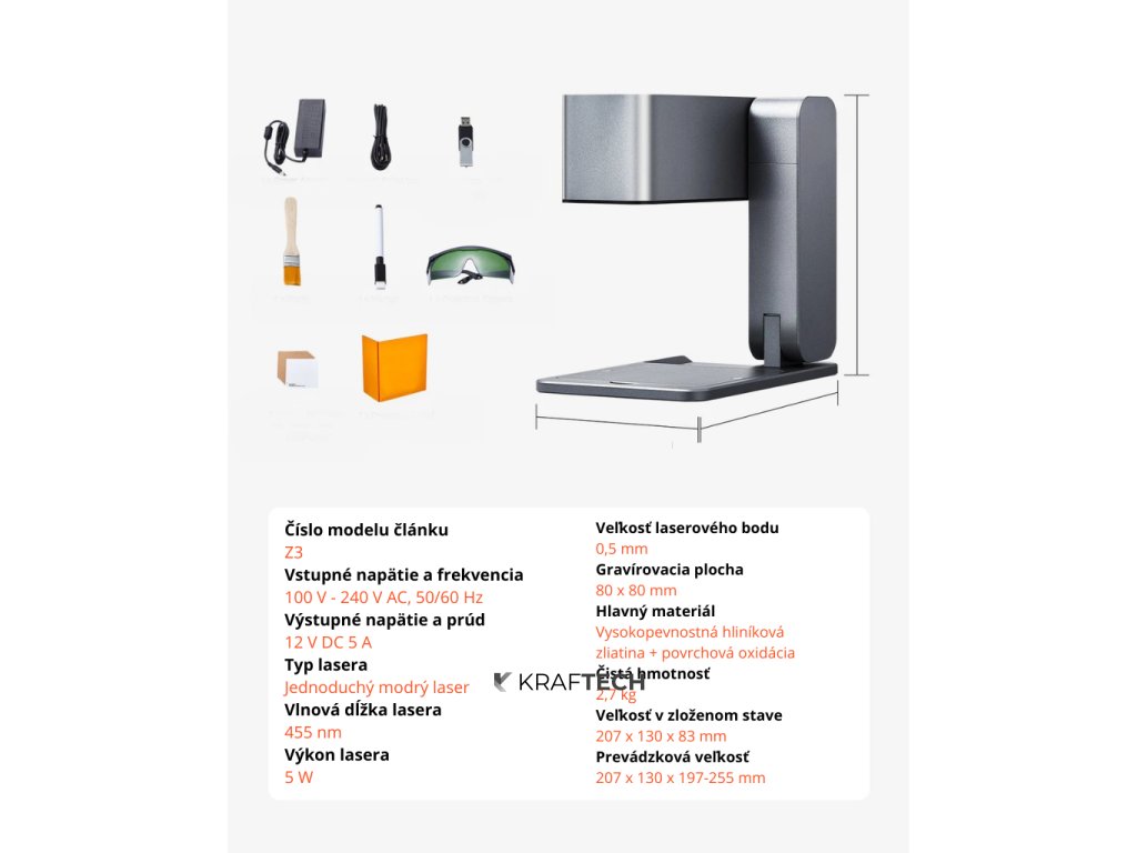 Tento kompaktný laserový gravírovací stroj s výkonom 5 W a rýchlosťou 600 mm/s umožňuje presné gravírovanie na ploche 8 x 8 cm. Vďaka modrému laseru s vlnovou dĺžkou 455 nm dokáže ľahko pracovať s materiálmi, ako je drevo, koža, keramika alebo textílie.