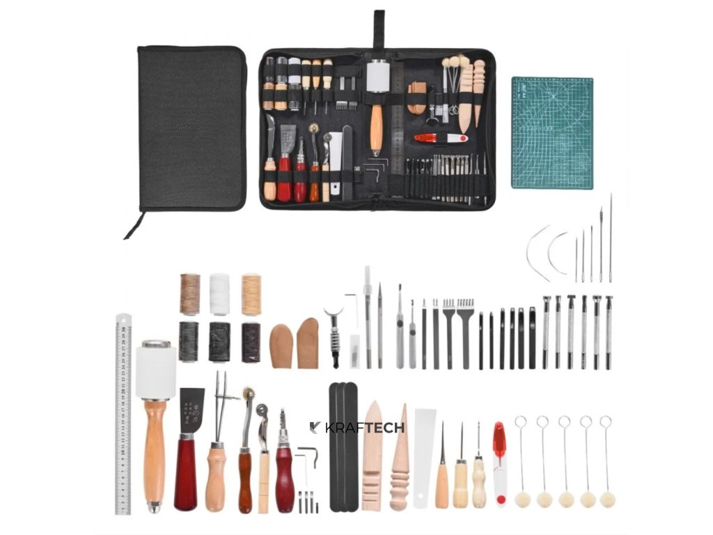 Sada obsahuje rezáky, šídla, dierovače, šijacie ihly, nite, značkovacie a raziace pomôcky – teda všetko, čo potrebujete na výrobu peňaženiek, opaskov, puzdier či menších doplnkov. Nástroje sú prehľadne uložené v plátennej taške s elastickými úchytmi, takže zostávajú na svojom mieste a sú vždy po ruke.