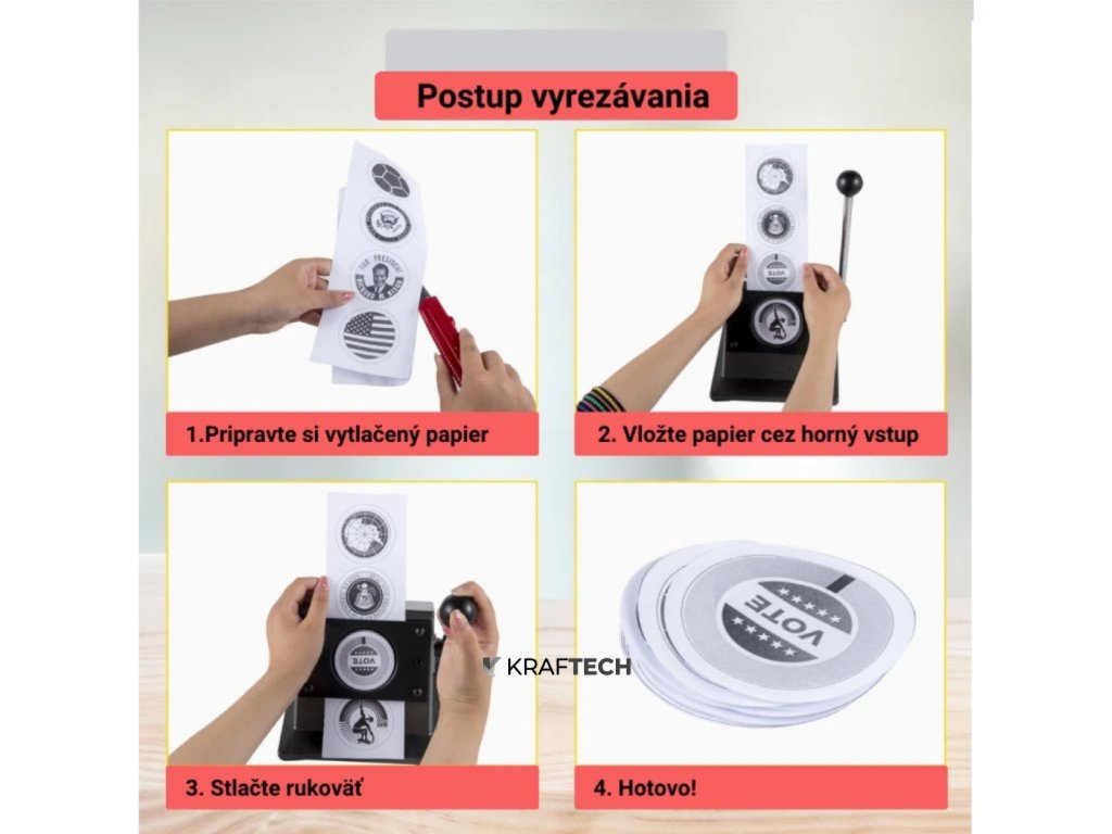S týmto strojom dokážete vyrobiť 100 až 200 kusov odznakov za hodinu. Vďaka plastovej sklznici a presnému dorazu matríc je chybovosť minimálna. Set je ideálny pre školy, športové akcie, politické kampane, neziskové organizácie alebo ako ziskový nástroj pre reklamné agentúry.