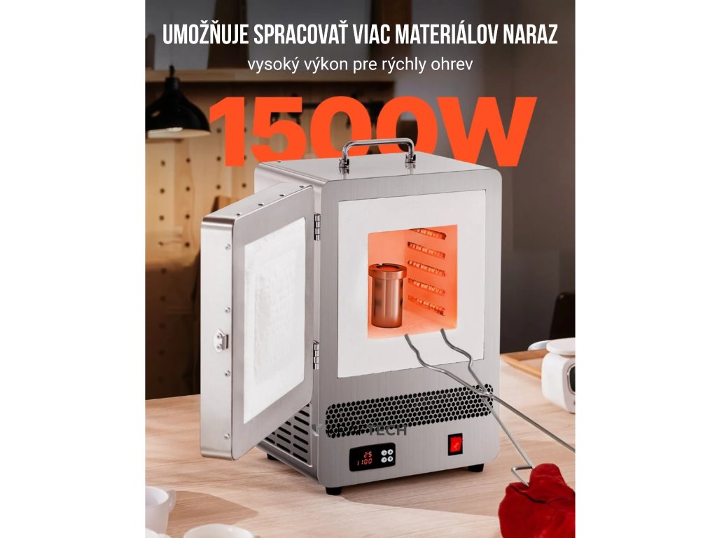 S výkonom 1500 W a integrovanými výhrevnými telesami dokáže roztaviť kovy do 1000 °C už za 34–38 minút, čo výrazne zvyšuje produktivitu práce.